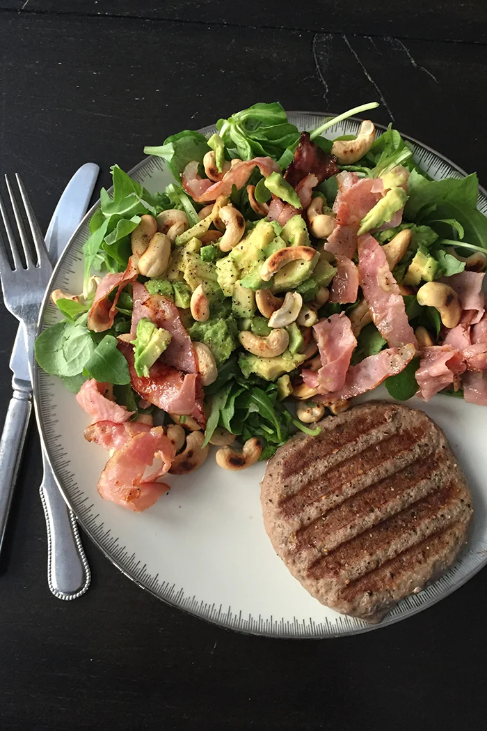 Ik maakte weer gebruik van de grill door er tartaar op te grillen nadat ik de groene avocado salade klaar had gemaakt. Die tartaartjes zijn zo klaar en die salade was wat meer werk: Veldsla en rucola met avocado, gebakken cashewnoten en bacon opgebakken in olijfolie, citroensap en knoflook. Een fijne lichte maaltijd zo voor onze training die avond.