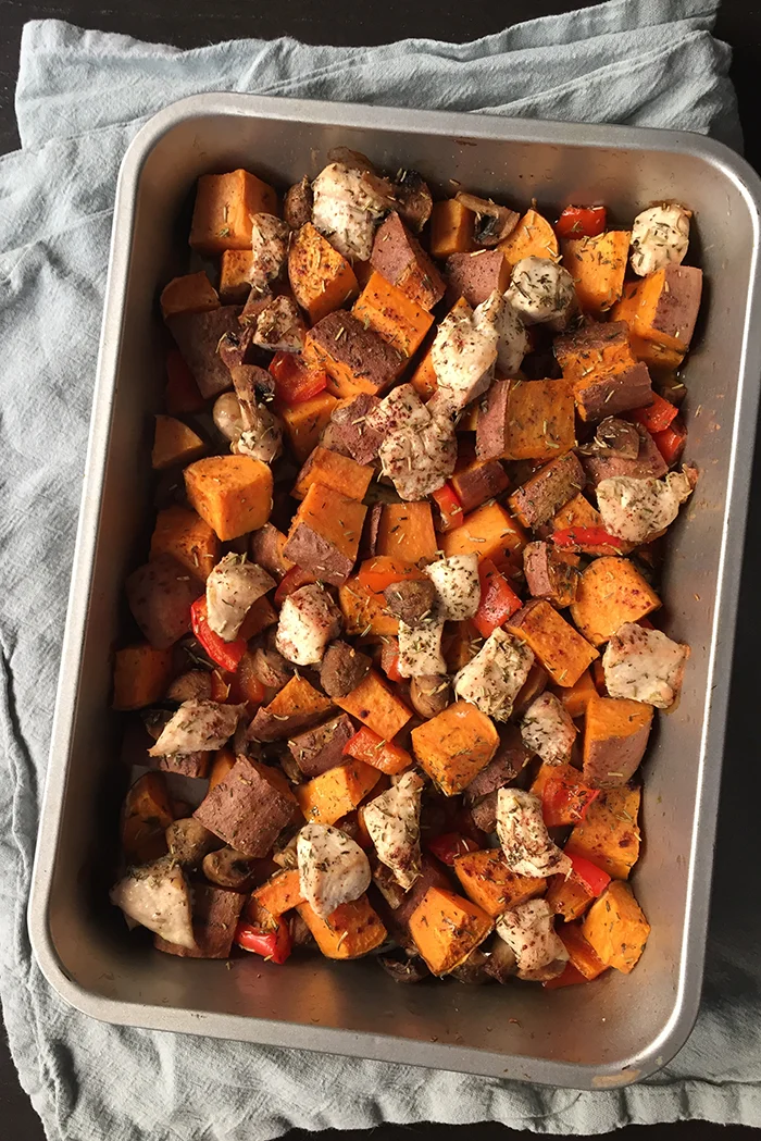 Zoete aardappel, daar heb je hem weer. Bijna standaard in huis hier en deze keer heb ik ze in grove stukken gehakt en samen met champignons, paprika, kip en een lekkere dressing in de oven geschoven.