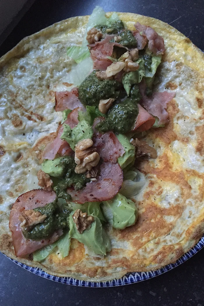 Op donderdag train ik altijd vroeg dus ik kookte erna pas, vandaar dat de foto iets donkerder is. Maar, het was lekker! Een eiwrap met ijsbergsla, avocadocreme, pesto (met walnoten), bacon en nog wat walnoten. De bedoeling was het met kip te maken i.p.v. bacon maar die was ik die ochtend vergeten uit de vriezer te halen..