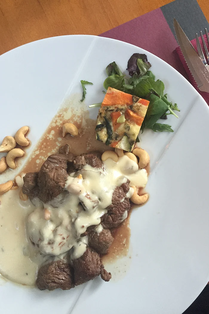 We zijn gisteravond heel gezellig uit eten geweest in Apeldoorn en hoewel ik vaak moeite heb met het kiezen van een hoofdgerecht, deze keer wist ik het direct: Ossenhaaspuntjes met cashewnoten en blauwschimmelkaassaus. Ik vind blauwe kazen heerlijk!