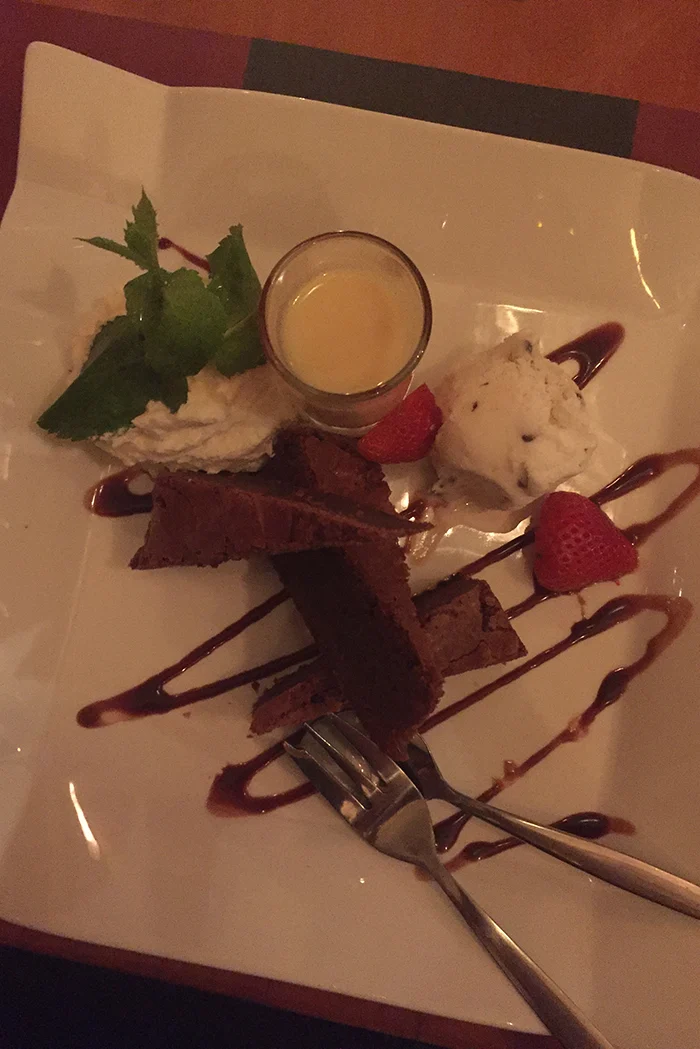 Ik ga niet uit eten zonder een nagerecht te bestellen, wel of geen ruimte, er MOET een toetje in. Ik koos voor de brownies (chocolate forever) met stracciatella ijs en warme vanille saus. Ik kreeg het niet op maar het was heerlijk!