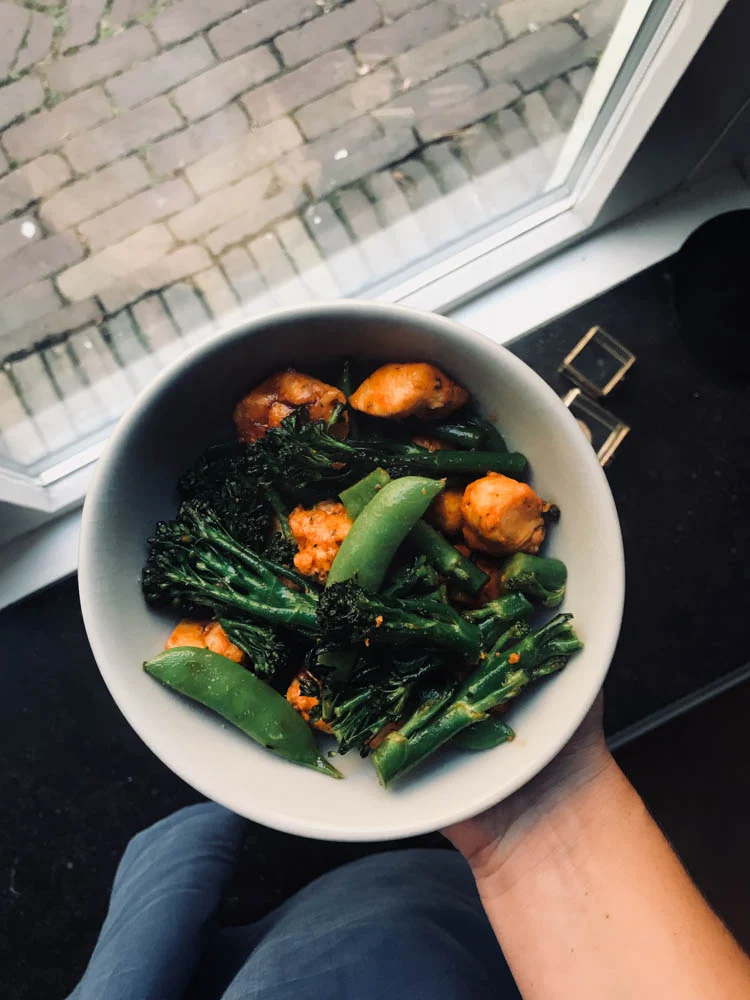 Ik deed dinsdag boodschappen en omdat ik daardoor best laat thuis was, deed ik even makkelijk. Ik had Thaise kipblokjes gekocht en wokte daar bimi en sugar snaps bij. Op zich niet heel bijzonder, máár.. die kip was een absolute verrassing. Heel lekker!
