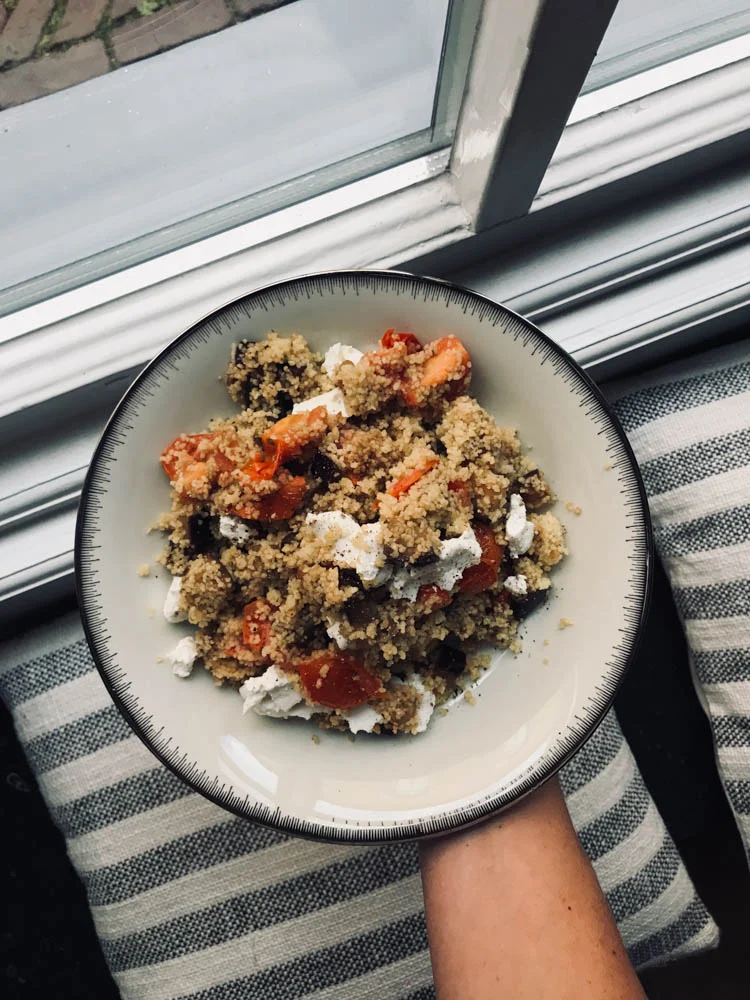 Ik maakte zondag een couscoussalade met gemarineerde aubergine, cherrytomaatjes en geitenkaas. Makkelijk gemaakt en erg lekker.