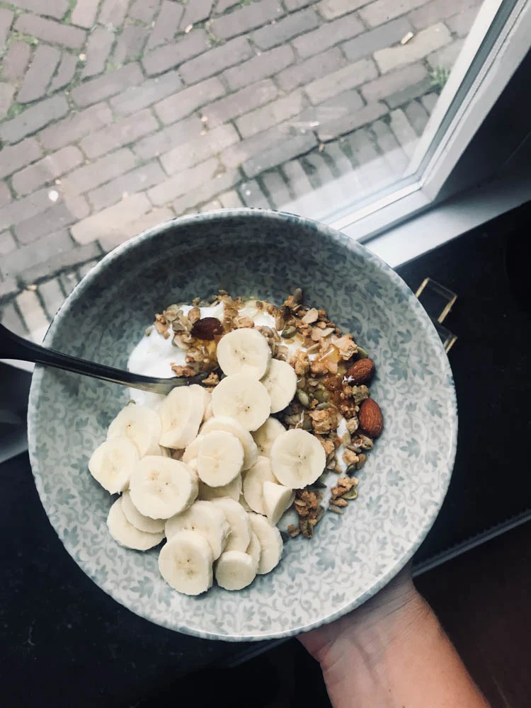 Ik trainde dinsdagavond een uurtje vroeger dan normaal gesproken en dan red ik het niet om ook nog te koken. Trek had ik wel dus ik maakt een bakje kwark met granola, banaan en honing.