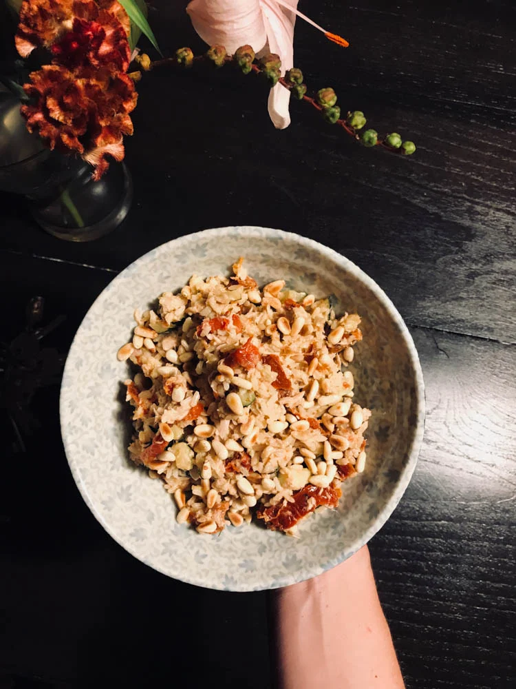 Na de training maakte ik nog een rijstsalade met tonijn, zongedroogde tomaatjes, veel courgette en pijnboompitjes. Ging er nog wel in na een lekkere training.