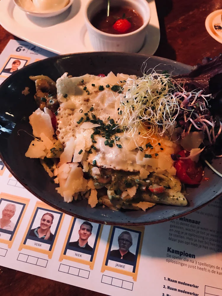 Weer een avondje werken en deze keer geen salade maar liepen we naar een eetcafé om de hoek. Ik koos voor pasta pesto met tomaatjes en parmezaan. Inclusief een heleboel ‘decoratie’; een gebakken ei en kiemgroenten. Ik at er teveel van, zat megavol maar kon er wel even op door :-)
