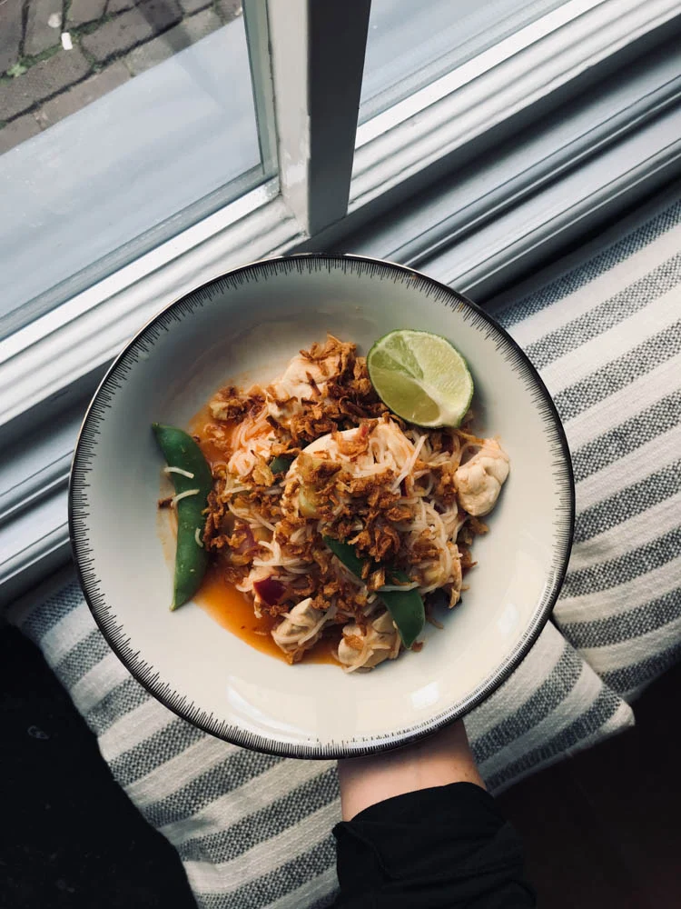 Ik maakte vrijdag een noodles gerechtje met groenten, kip en wat Thaise smaken. En natuurlijk gebakken uitjes erover.