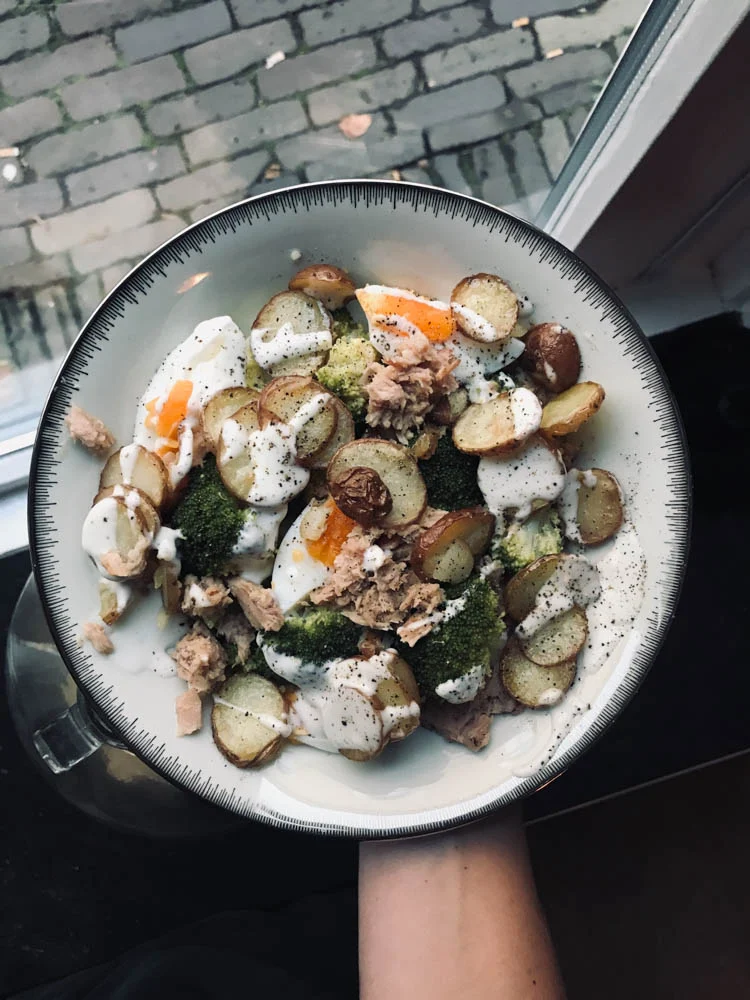 Dit is een soort van salade niçoise maar dan zonder de boontjes en met broccoli. Verder zoals we hem kennen, met tonijn, aardappel, ei en ik maakte er een mayo/citroendressing bij. Gezonde hap op de maandagavond.