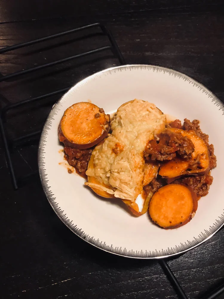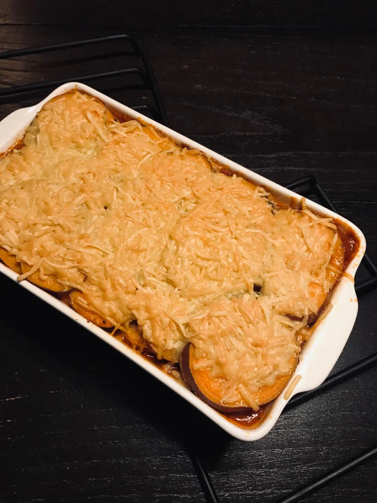 Tobias en ik eten niet altijd samen gezien onze verschillende werktijden, dus vaak laat ik voor hem iets op het fornuis staan zodat hij gelijk kan opscheppen. Altijd als hij deze ovenschotel ziet, wordt hij er blij van. Een gehaktschotel met tomatensaus, zoete aardappel en een dikke laag oude kaas. Best wel gezond en heel vullend. Ook maken? Hier staat -ie.