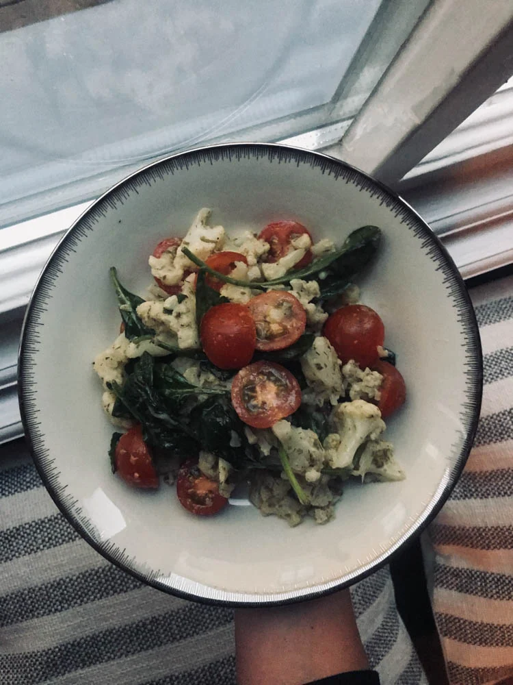 Het werd al donker toen ik mijn bord volschepte dus aankomende week zullen waarschijnlijk alle foto’s onder de eetkamertafellamp gemaakt gaan worden. In ieder geval; een favoriet recept van me op dit moment. Je hebt niet veel nodig en het resultaat is echt heel erg lekker. Van Ottolenghi: bloemkool eerst kort gekookt en daarna gegrild, met een dressing van o.a. mosterd, knoflook, kappertjes en appelciderazijn. Samen met wat spinazie en cherrytomaatjes. Met een hele bloemkool maak je een flinke portie, dus ik at het vrijdag nog een keer.