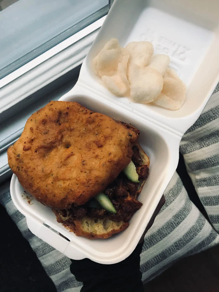 De Javaanse toko dus. We liepen erheen en kozen daar uit wat we wilden hebben. Ik had helaas niet heel veel honger dus ik hield het bij deze bara met Javaanse kip. HEEL lekker. Tobias daarentegen had heel erg trek dus hij at ook zo’n bara onderweg naar huis al op. En voor thuis had hij nog eens een nasi-gerecht met pittige kip. Wat overigens echt een mega-bak was die hij (natuurlijk ;-)) niet op kreeg dus waarschijnlijk eet hij daar vanavond nog van.