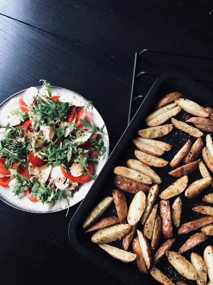 Volgens mij had ik hier het avondeten van maandag eigenlijk bedacht. Maar daar had Tobias dus geen zin in. Hij zag een grote bak rode aardappeltjes en wilde die graag eten, gebakken uit de oven. Prima, heeft hij ook gelijk klaargemaakt. Ik maakte er een simpele salade caprese bij.