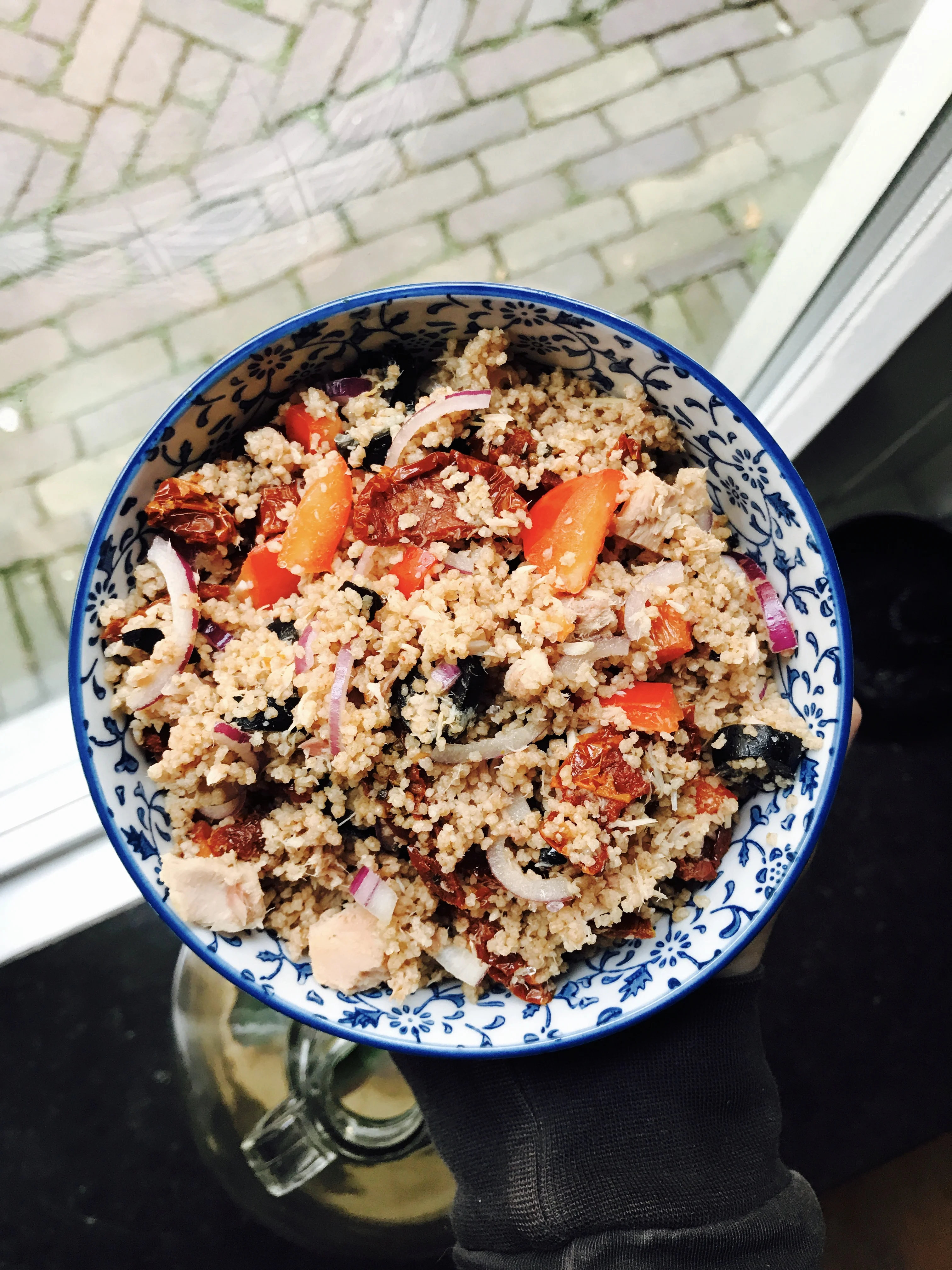 Tja.. hier ging op het laatste moment dus even iets fout. Ik had een salade gemaakt van spelt couscous (een uitprobeersel, kwam het tegen bij de Appie), tonijn, rode ui, paprika, zwarte olijven en zongedroogde tomaatjes. Vond het zelf op voorhand al als een lekkere combinatie klinken. Beetje jammer dat het potje zeezout brak waardoor de hele boel erin kletterde. Heb het grootste gedeelte eruit gehaald maar het mocht niet baten, superzout was het nog. Shit happens.