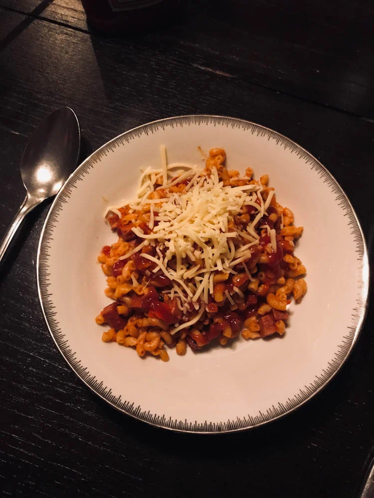 We aten namelijk oldskool macaroni. De minimalistische variant met alleen elleboogjes, tomatenpuree, smac, tomatenketchup en kaas. Zoals onze moeders hem vroeger maakten. Al vond Tobias mijn versie nog ‘exotisch’ met wat rode paprika erdoor.