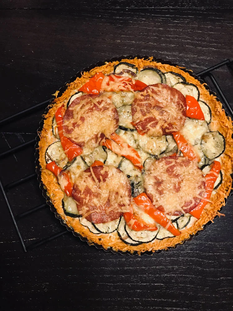 Ik zag vorige week een hele mooie quiche online staan, door Sab gemaakt. Dus deze plande ik in. Een bodem van zoete aardappel, gevuld met gegrilde groenten, salami en een beetje kaas.