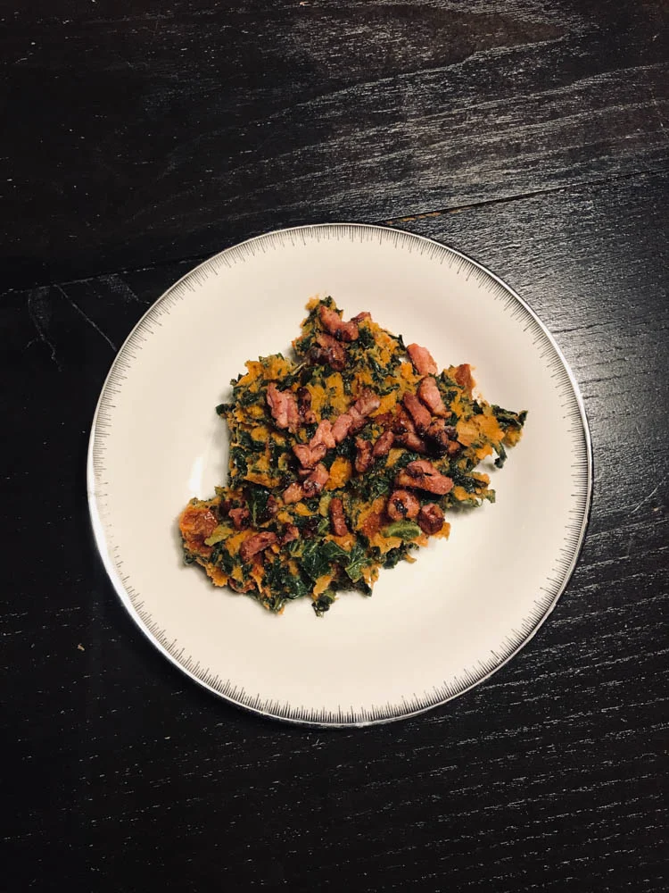 Een stamppotje; met zoete aardappel, gebakken boerenkool, uitgebakken spekje en zongedroogde tomaatjes.