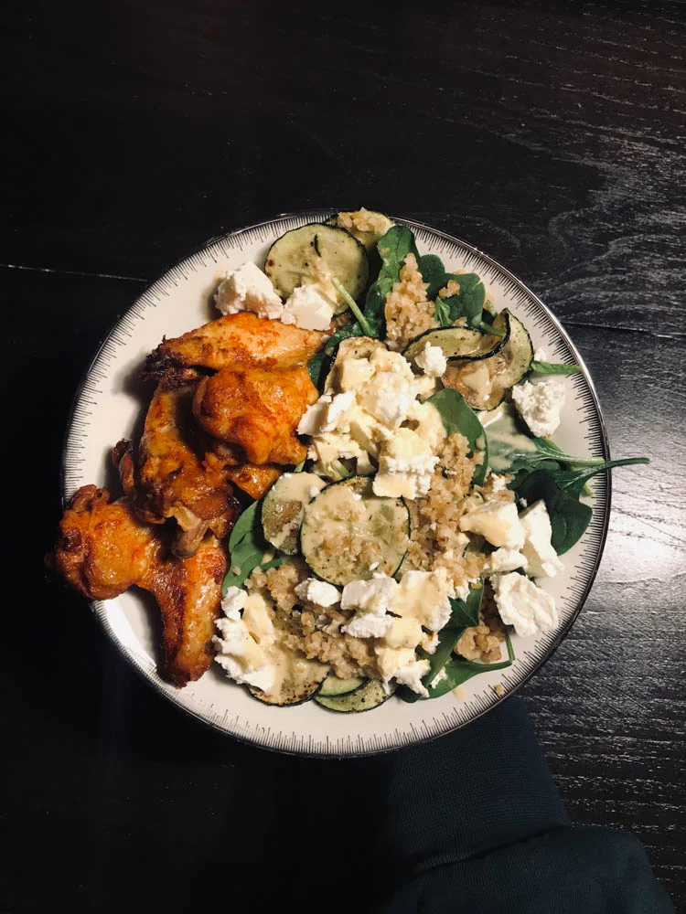 Ik heb ’s morgens de slowcooker aangezet met gemarineerde kip. Erbij maakte ik ’s avonds een salade van spinazie, bulgur, courgette, witte kaas en een mosterddressing.