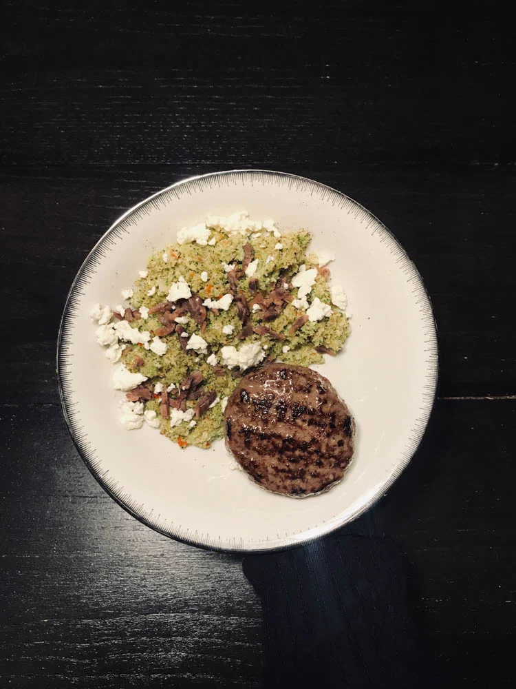 Weer een fijn voorbeeld van hoe saai eten eruit kan zien met een donkere tafel en lekker fel licht.. Nouja, het was lekker deze broccoli couscous met ansjovis en witte kaas. Ik bakte de broccoli overigens op met een uitje, knoflook en rode peper. Erna roerde ik er nog wat citroensap en extra olijfolie doorheen. Erbij een burger.
