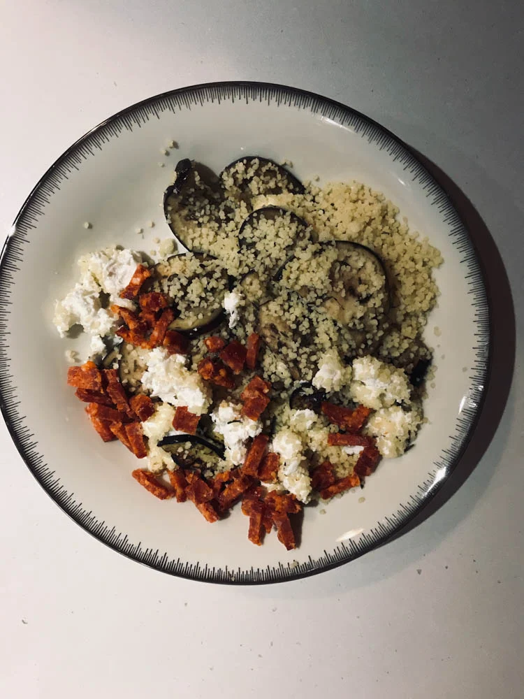 Ik bakte een grote aubergine op in plakken en mengde dit met een hele smaakvolle couscous en geitenkaas. Nog een beetje chorizo erbij maar eigenlijk had dat niet gehoeven. Lekker makkelijk en snel gemaakt.