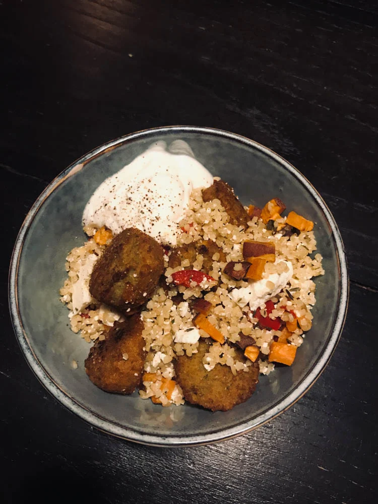 Ik roosterde blokjes zoete aardappel, courgette en paprika in de oven en mengde deze met bulgur. Falafel bakte ik op, nog een beetje kruiden erdoor en klaar. Heel lekker met een dot Griekse yoghurt.