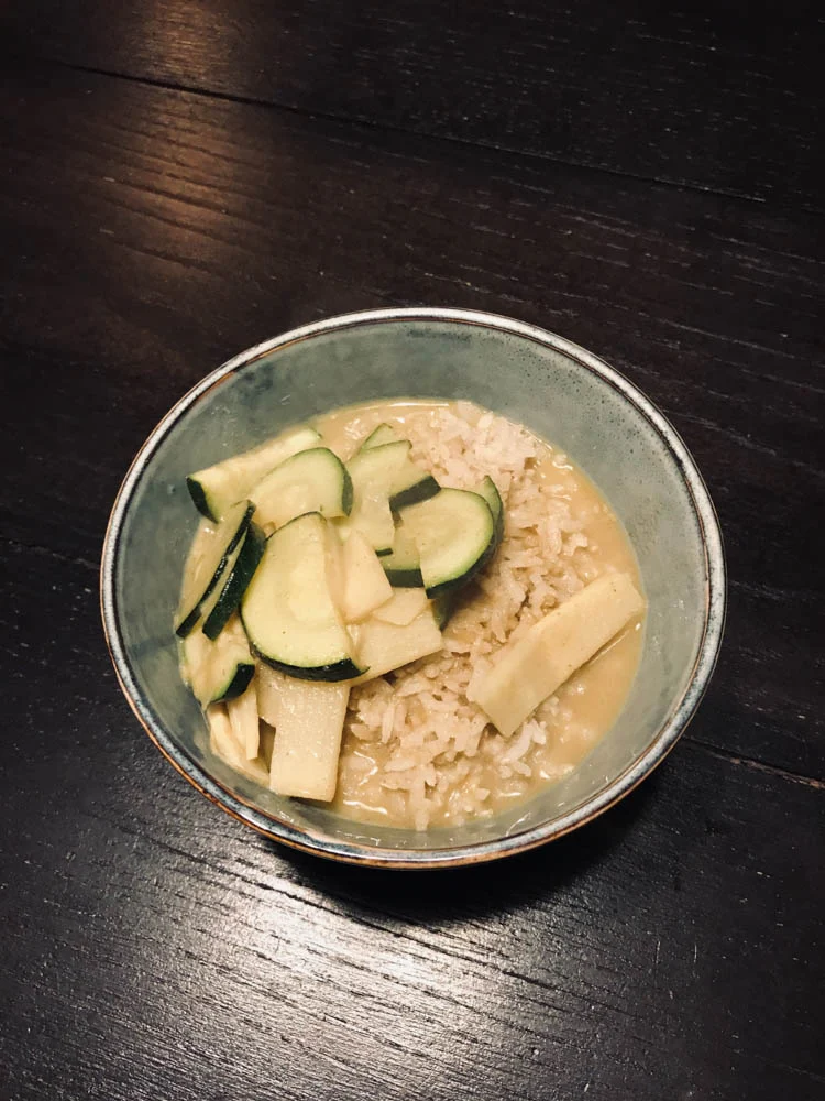 Ik bakte courgette op en voegde daar nog wat bamboescheuten aan toe. Vervolgens een groene currypasta, kokosmelk en ik kookte er rijst bij. Een hele simpele maaltijd, maar wel lekker.