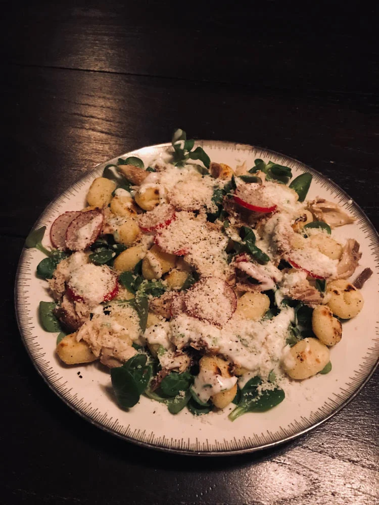 Dinsdag stond ik dus in de supermarkt met werkelijk geen idee wat ik wilde maken. Ik zag aardappeltjes en bedacht me dat ik daar wel zin in had. Echter deed het me ook denken aan deze gnocchi salade met radijsjes, makreel, veldsla, en bieslookmayo. Dus daar haalde ik de nodige ingredienten nog voor in huis.