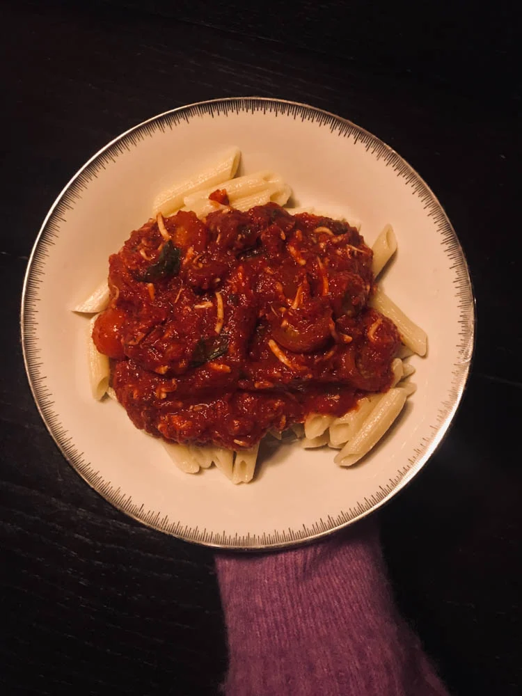 Heel fijn, als Tobias in de middag al appt dat hij aan het koken is. Ik hoefde dus niks te doen die avond en dat kwam goed uit i.v.m. meestal een drukke woensdagavond. Hij maakte een lekkere pasta, met o.a. cherrytomaatjes, verse basilicum en kaas.