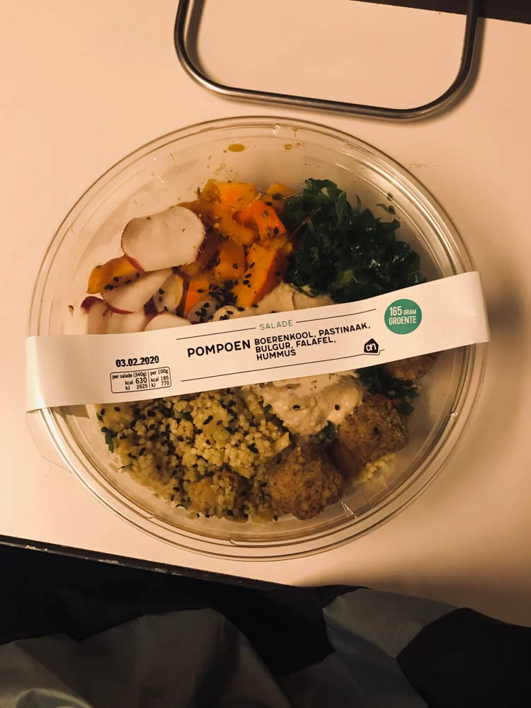 Ik was donderdagavond in Enschede bij een DesignTalk en daar ben ik direct vanuit mijn werk naartoe gegaan. Het plan was om ’s avonds thuis gewoon te koken maar toen ik richting het station liep om weer naar huis te gaan, besloot ik dat ik daar niet op wilde wachten. Ik had wel trek namelijk, en om dan thuis ook nog te gaan koken vond ik een te ingewikkeld plan ;-) Ik haalde bij de AH To Go een salade (overigens; meer keuze tegenwoordig) en die was prima.