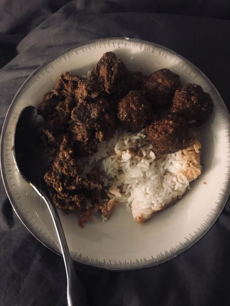 Voor de oplettende kijker: dit bord staat inderdaad op een dekbed. Ik lig sinds gisteren ziek in bed en eten koken was er niet bij. We bestelden wat Indonesische gerechtjes en ik at o.a. wat rendang, rijst en gehaktballetjes.