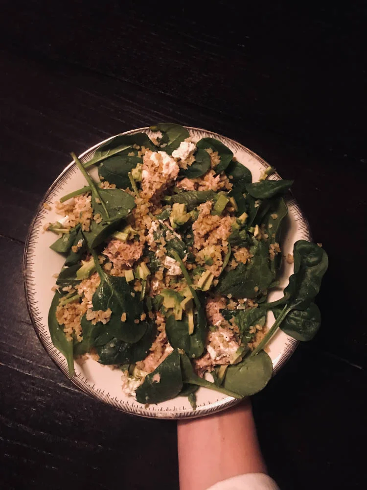 Ja hier weer zo’n geval van iets vergeten. Er hadden nog zongedroogde tomaten in deze salade van spinazie, tonijn, mayo, citroen, bulgur en avocado moeten zitten. Maar ook zo, wel lekker!