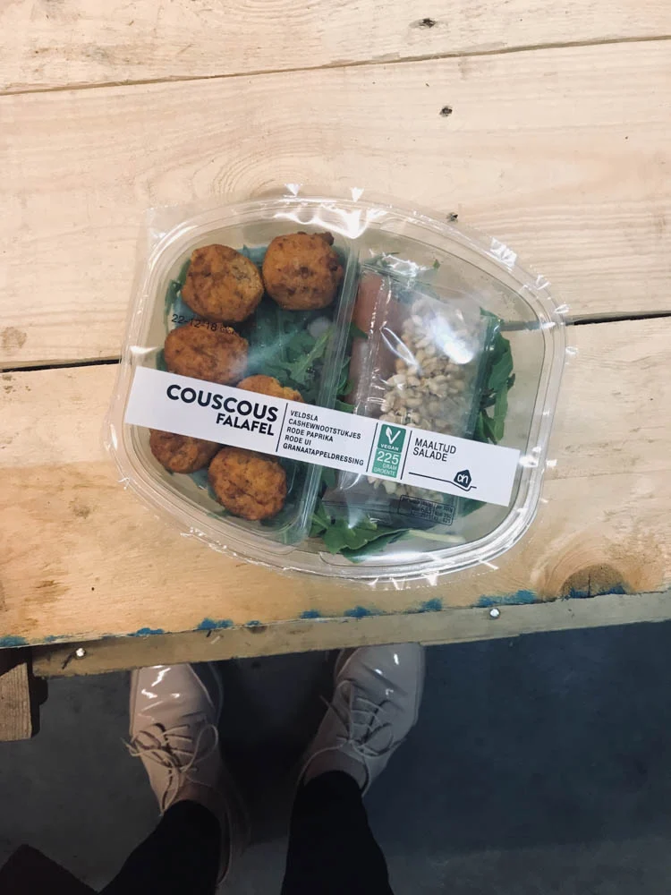 De planning was: vooruit koken voor woensdag. De realiteit was: geen tijd. Dus ik hopte snel nog even een Appie binnen voor een maaltijdsalade. De variant met falafel en couscous, altijd goed.