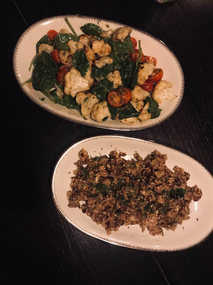 Twee salades van Ottolenghi die ik je echt kan aanraden eens te maken. Een salade met geroosterde bloemkool en een hele lekkere dressing. De andere met bulgur, paddenstoelen en feta.