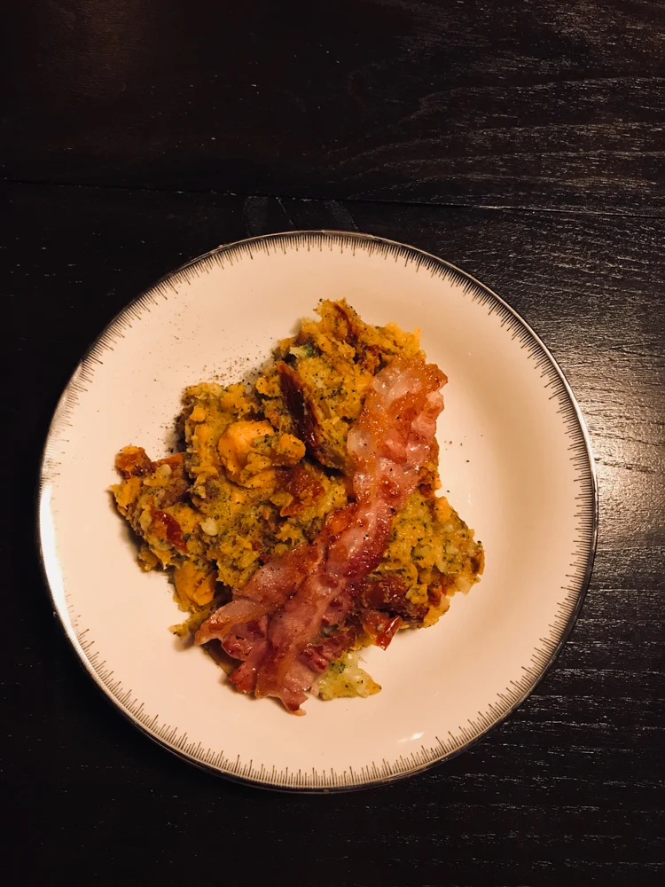 Er was maar 1 ‘normale’ kookdag deze week en dat was vrijdag. Ik maakte stamppot van zoete aardappel, broccoli, zongedroogde tomaatjes en spek.