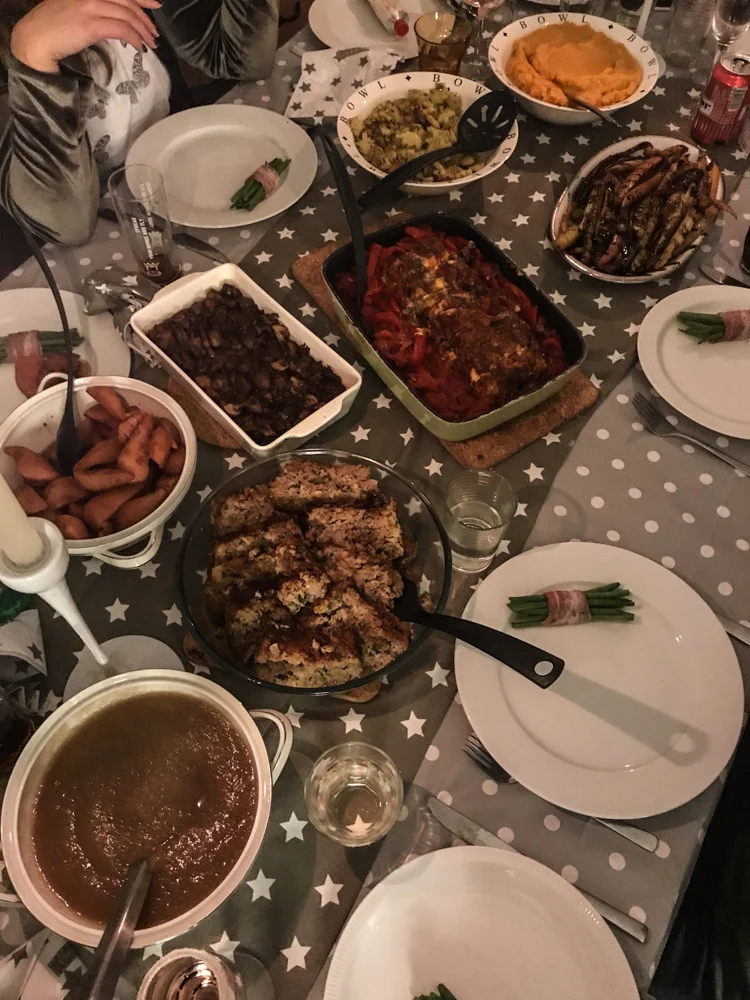 2e Kerstdag aten Tobi en ik voor het eerst met vrienden in plaats van met familie. Met een groep van 13 personen zorgden we voor het diner, iedereen maakte een gang en ik zorgde voor de bijgerechten. Ik maakte (klassiek): stoofpeertjes, appelmoes, haricots verts + groene aspergepunten in spek, regenboogwortelen in rozemarijn en kastanjechampignons in balsamico. Naomi maakte: meatloaf met bbq-saus en Italiaanse meatloaf met cheddar (van Jamie Oliver, héél lekker), kerstboomaardappeltjes en zoete aardappelpuree. Heel veel lekker eten!