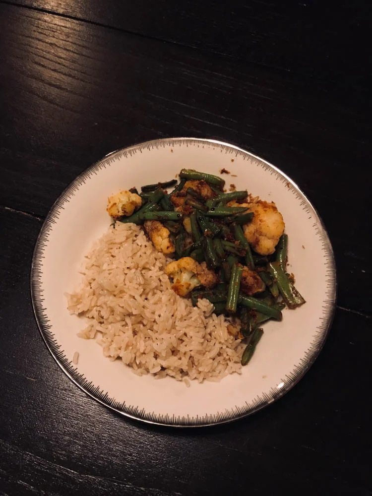 Ik maakte van de sperzieboontjes en de bloemkool een Oosterse variant. Met o.a. wat curry, gember, knoflook, kokos en ui. Erbij zilvervliesrijst.