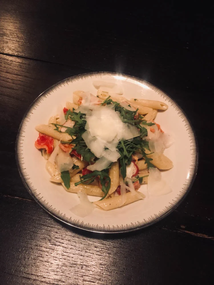 Pastasalade met radijsjes, rucola, paprika, pecorino en een beetje truffelmayo.