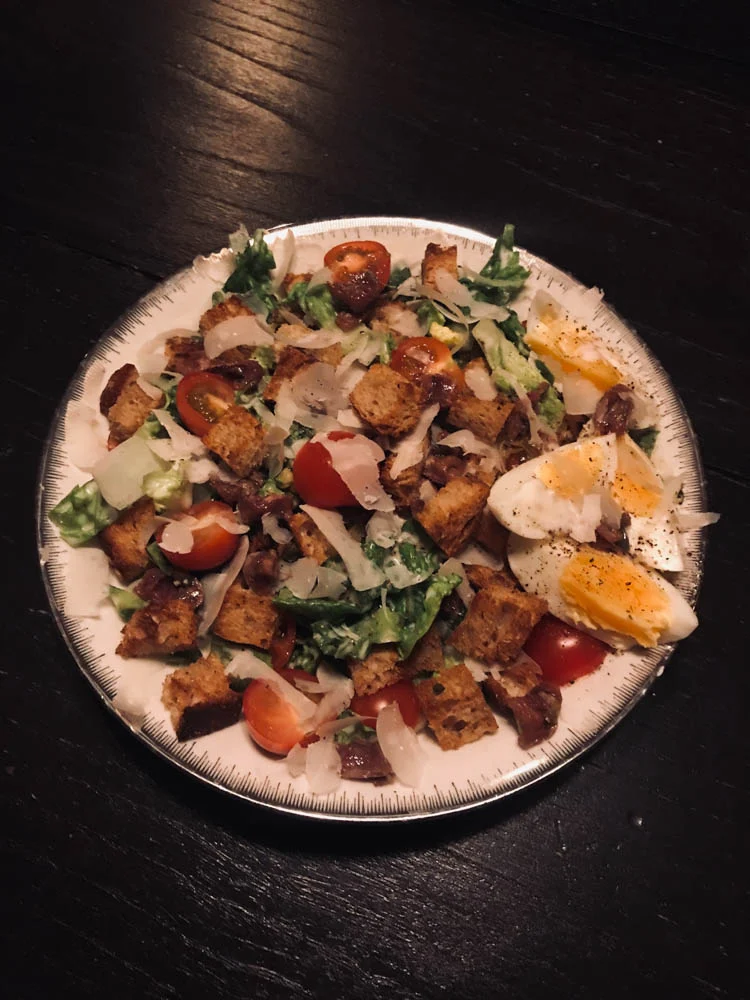 Ik maakte een soort XXL Ceasar Salad. Ten eerste een flink bord vol maar ook aangevuld met nog een beetje verse pesto en flink wat zelfgemaakte croutons. Super smaakvol en lekker om zo af en toe in te plannen.