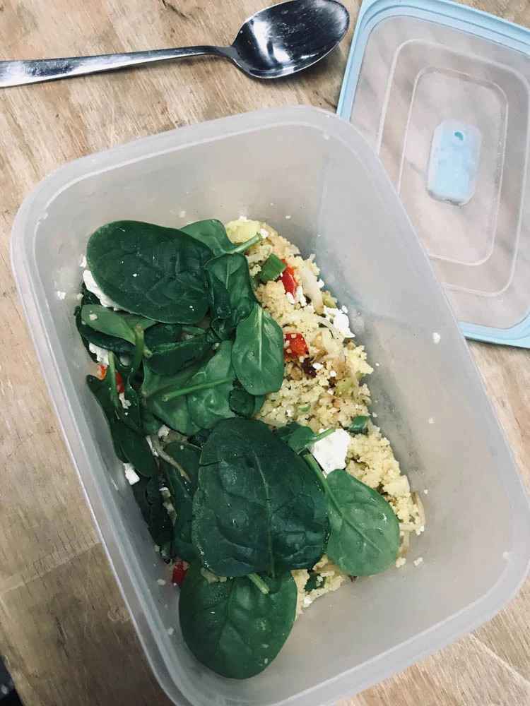 Ik had op de planning staan om een lekkere ovenschotel met aubergine te maken, maar om 17:05 werd ik gebeld met de vraag of ik die avond alle lessen bij de Barbell Club over wilde nemen. Er was een foutje in de planning gemaakt. En alle lessen overnemen betekent voor mij om 17:30 al in de auto moeten zitten, dus koken, of überhaupt eten heb ik over moeten slaan. Gelukkig trainde er ook een vriendin mee die wat van haar avondeten voor me meenam; couscous met groenten, spinazie en feta.