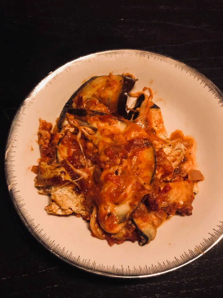 Je hebt al kunnen lezen dat er voor dinsdagavond eigenlijk een aubergineschotel op de planning stond; die maakte ik dus donderdag. Met een zelfgemaakte tomatensaus en lekker wat kaas, onder andere mozzarella en jong belegen. Een rommeltje op mijn bord maar erg lekker.
