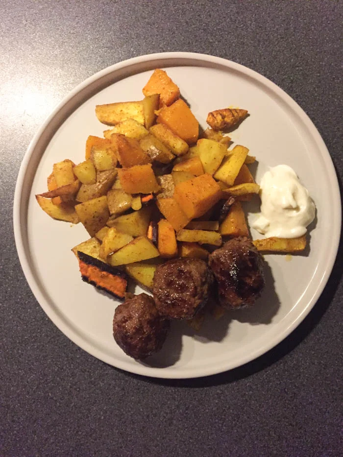 Ik had ’s middags heel gezellig de verjaardag van een vriendin in Arnhem en was daardoor die avond wat later thuis. Zoals ik al zei ben ik toch maar even aan de slag gegaan in de keuken want Tobias en ik hadden allebei veel zin in de gehaktballen naar het recept van mijn moeder (KETJAP) en ik wilde graag die enorme pompoen die ik al had gebruikt voor een ander recept, even opmaken. Samen met pastinaak, aardappel en wat kruiden uit de oven. Even een snijklusje maar daarna heb je er geen omkijken meer naar. Toch wel makkelijk.
