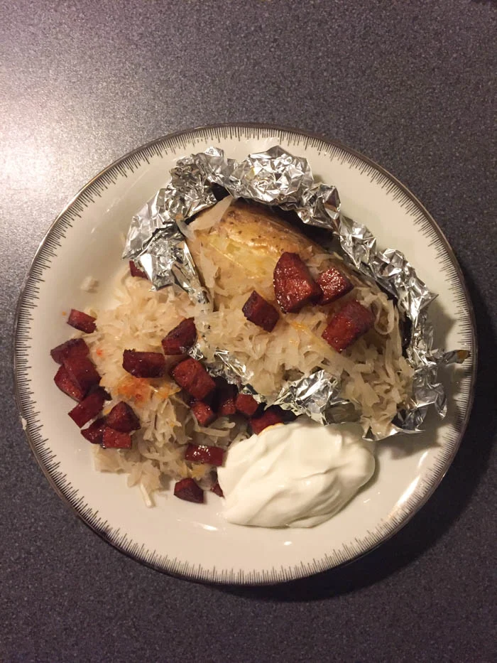 De oven is mijn vriend dus net als gisteren heb ik daar uit gemak een paar aardappelen in bereid. Gepoft deze keer, samen met zuurkool, opgebakken chorizo en lekker fris, Griekse yoghurt.