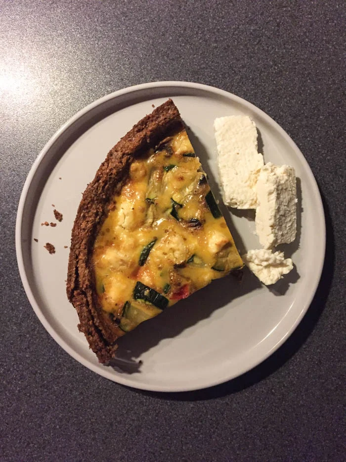 Quiche! Want ik had zin om er eentje te maken. En ik wilde eens testen of ik een bodem kon maken van pompoen en noten, in plaats van bladerdeeg. En dat lukte hartstikke goed.