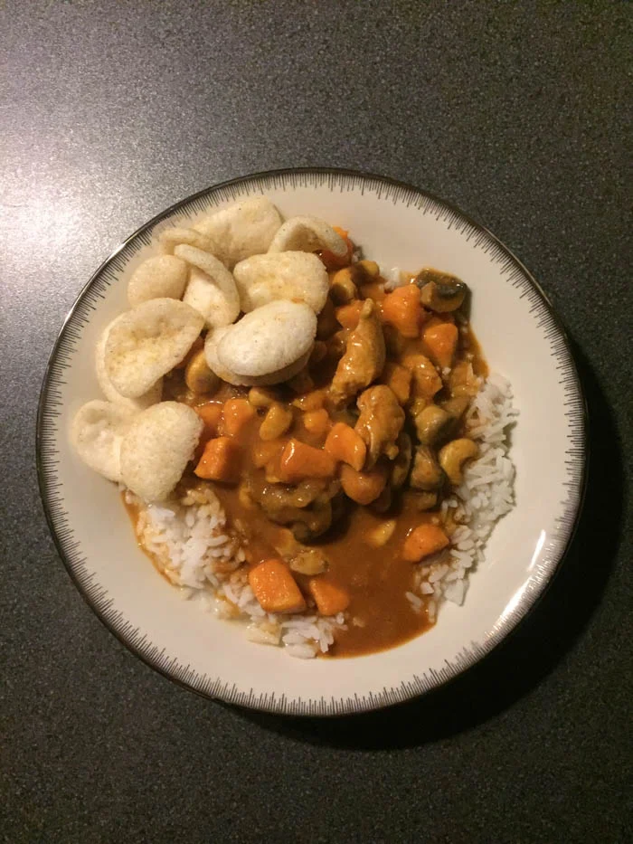 Ik was vrijdag even bij de toko bij mij om de hoek om weer een flinke voorraad geraspte kokos te halen (o.a. voor een héél lekker zoet recept voor OMF) en daar zag ik verschillende potten met curry staan. En omdat ik gisteren een vriendin te eten kreeg die net als ik gek is op Aziatisch eten, nam ik alvast een pot Massaman curry mee. Heb ik lekker gevuld met zoete aardappel, champignons, kip en cashewnoten. Met pandan rijst en Java kroepoek die ik eet alsof het chips is.
