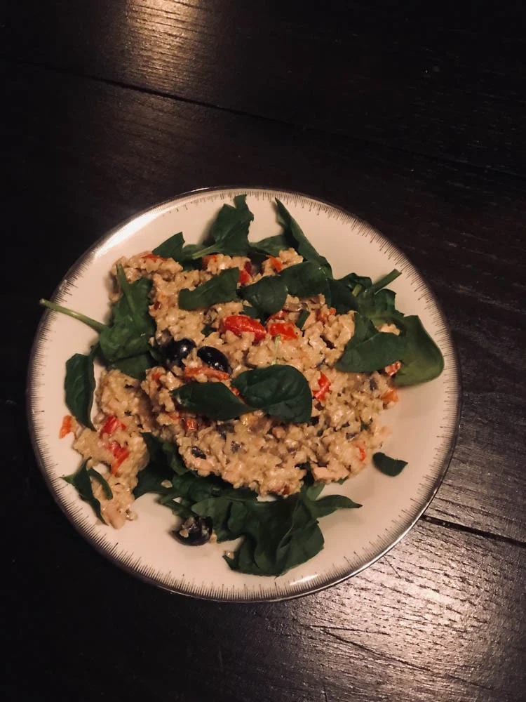 Oeps, zondag vergat ik een foto te maken dus we beginnen met de maandag. Ik maakte een bulgur salade met o.a. zoete muntpaprika, zwarten olijven en feta. En spinazie.