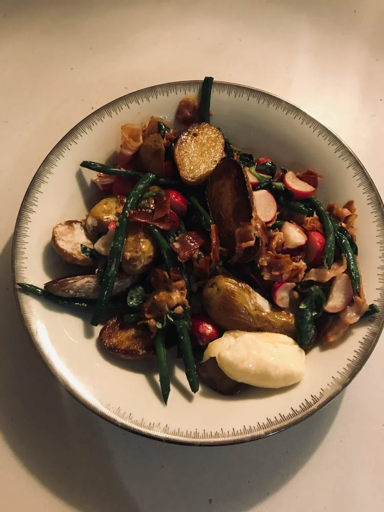 Deze lekkere aardappelsalade met aioli en groene aspergepunten maakte ik ook zaterdag en daar stond nog flink wat van in de koelkast. Ik was het eigenlijk een beetje vergeten en had al bedacht wat ik die avond wilde koken, maar toen ik dit zag staan besloot ik dit eerst op te maken. Zonde anders toch?