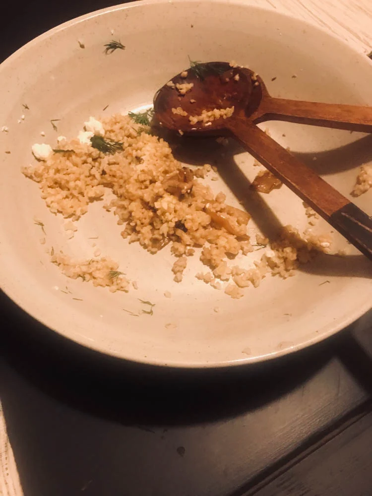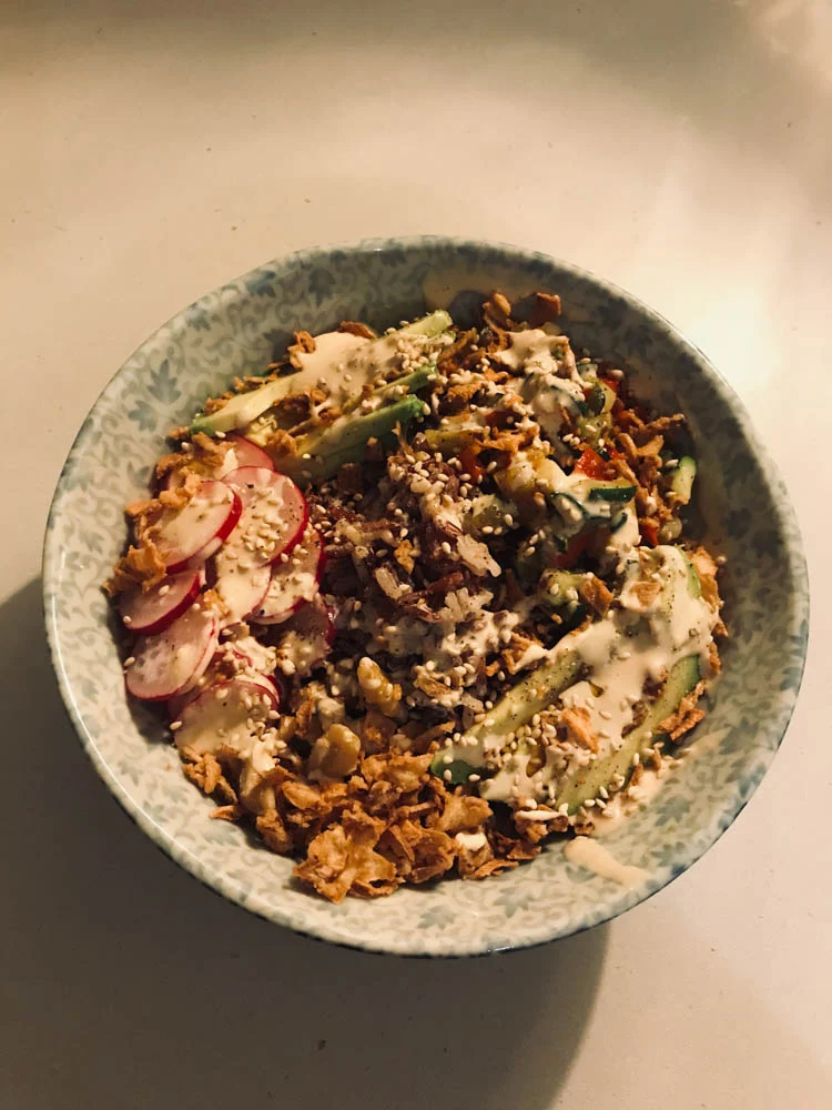 Je zou denken dat het een poké bowl is, maar het is een buddha bowl. Zelfde looks, andere smaak(makers). Ik vond ‘m erg goed gelukt al zeg ik het zelf, met rode rijst als basis en daar bovenop gebakken courgette en paprika, avocado, radijsjes, walnoten, gebakken ui en een misodressing van misopasta, mayonaise en water. Volle bak, heel smaakvol.