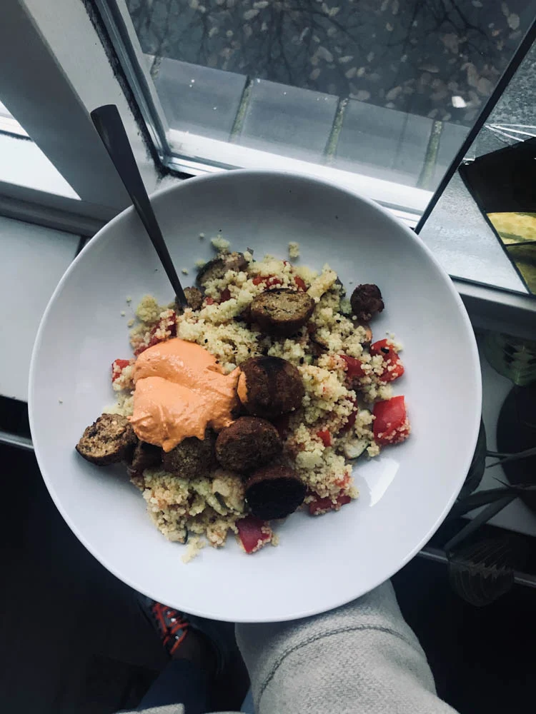 Woensdag was ik einde middag al in Apeldoorn en in de avond moest ik daar weer zijn. Ik besloot dus niet om nog naar huis te gaan om enkel te koken, maar ging in op het aanbod van vriendinnetje Suus om bij haar te eten. Veel handiger. Ze maakte couscous (is er net zo’n fan van als ik) met gegrilde groenten uit de oven, falafel en pittige humus. Heel erg een maaltijd die ik ook had kunnen maken. En lekker!