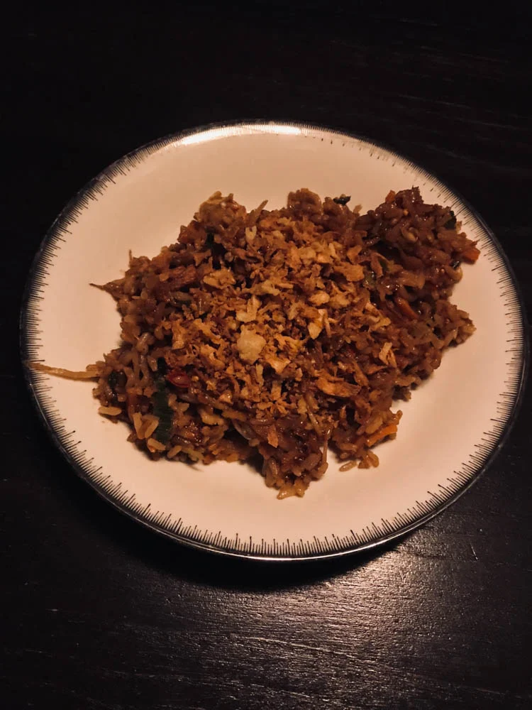Ik at inderdaad de salade die ik maandag maakte, op woensdagavond voor het trainen nog een keer. Maar dat bleek bij thuiskomst niet voldoende. Ik had nog heel erg trek en gelukkig had ik ook van de nasi flink wat over. Zo gezegd, zo gedaan. Even opbakken, beetje ketjap erbij, en klaar (veel te veel overigens).