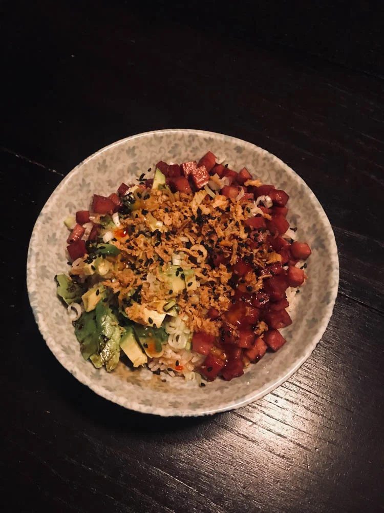 Yes, een pokébowl! Met gebakken smac, avocado, een lente-ui en nog wat ingrediënten.