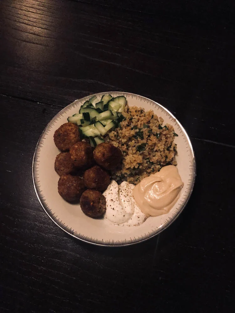 Wederom home alone en ik zag in de Albert Heijn dus de salade met falafel. Ik had wel zin om te koken dus ik kocht niet de salade, maar alle ingrediënten voor hoe ik het zelf het liefste eet. Met verse koriander, munt, bulgur en humus.
